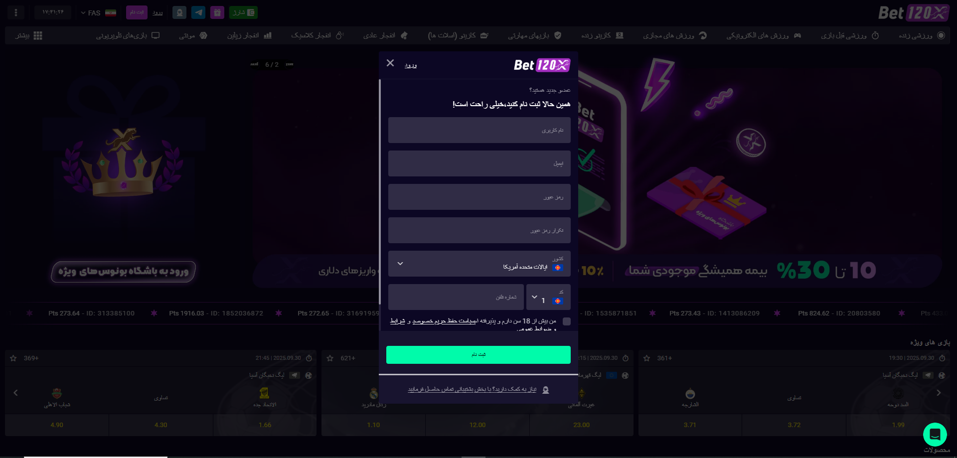 1. ثبت نام و ورود به حساب کاربری در سایت بت ۱۲۰.