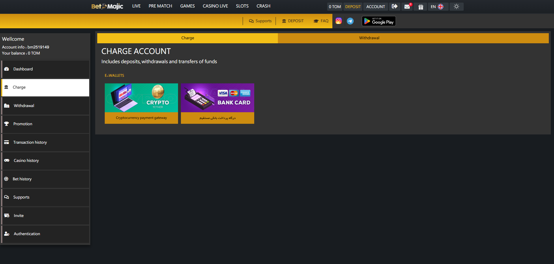 شارژ حساب: ابتدا کاربران باید حساب خود را شارژ کنند تا سرمایه لازم برای شرط بندی در دسترس باشد.