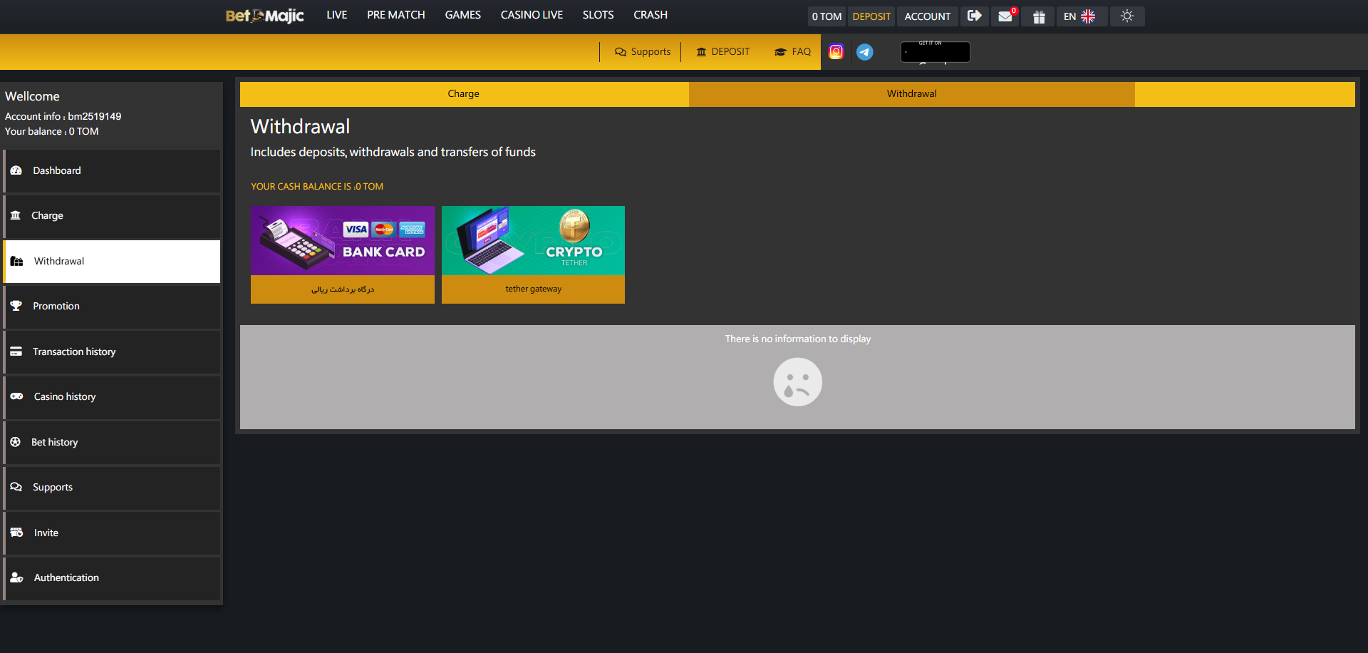 برداشت در بت مجیک از طریق درگاه بانکی، تتر و ترون امکان پذیر است. کاربران با ورود به حساب کاربری، انتخاب روش مناسب و وارد کردن اطلاعات حساب یا کیف پول خود، می توانند وجه را به سرعت دریافت کنند.