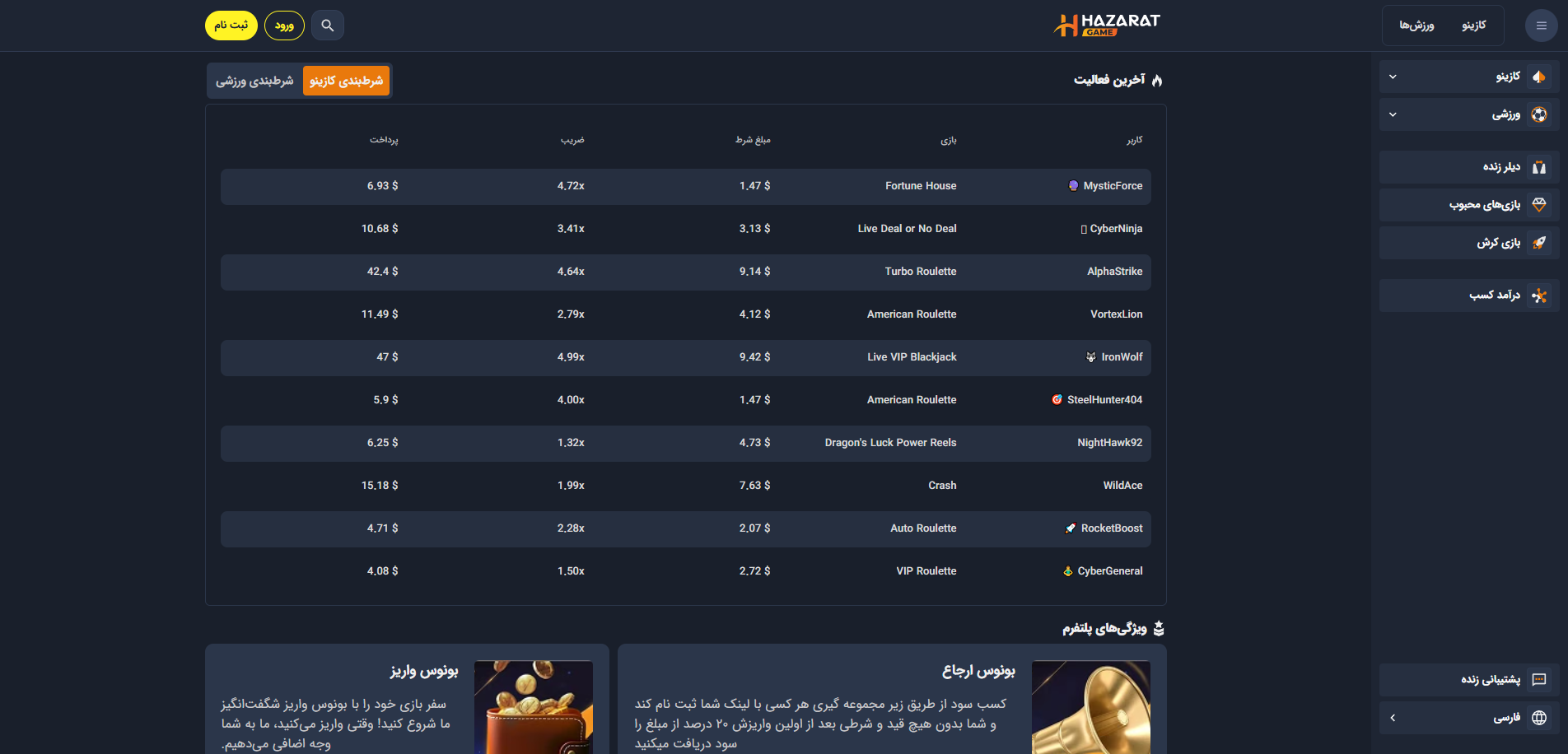 سایت Hazarat یکی از نام های شناخته شده در میان کاربران ایرانی است که با امکانات متنوع و محیط کاربری ساده خود جایگاه ویژه ای پیدا کرده است. این سایت علاوه بر بازی های کازینویی کلاسیک مانند پوکر و رولت، بخش پر طرفدار بازی انفجار را نیز در اختیار کاربران قرار داده است. طراحی محیط ساده و در عین حال حرفه ای باعث شده تا افراد با هر سطح تجربه بتوانند به راحتی در بخش های مختلف سایت فعالیت داشته باشند. به روز رسانی های مداوم و اضافه شدن ویژگی های جدید نیز باعث شده تا کاربران حس امنیت و پایداری بیشتری نسبت به فعالیت در این سایت داشته باشند.