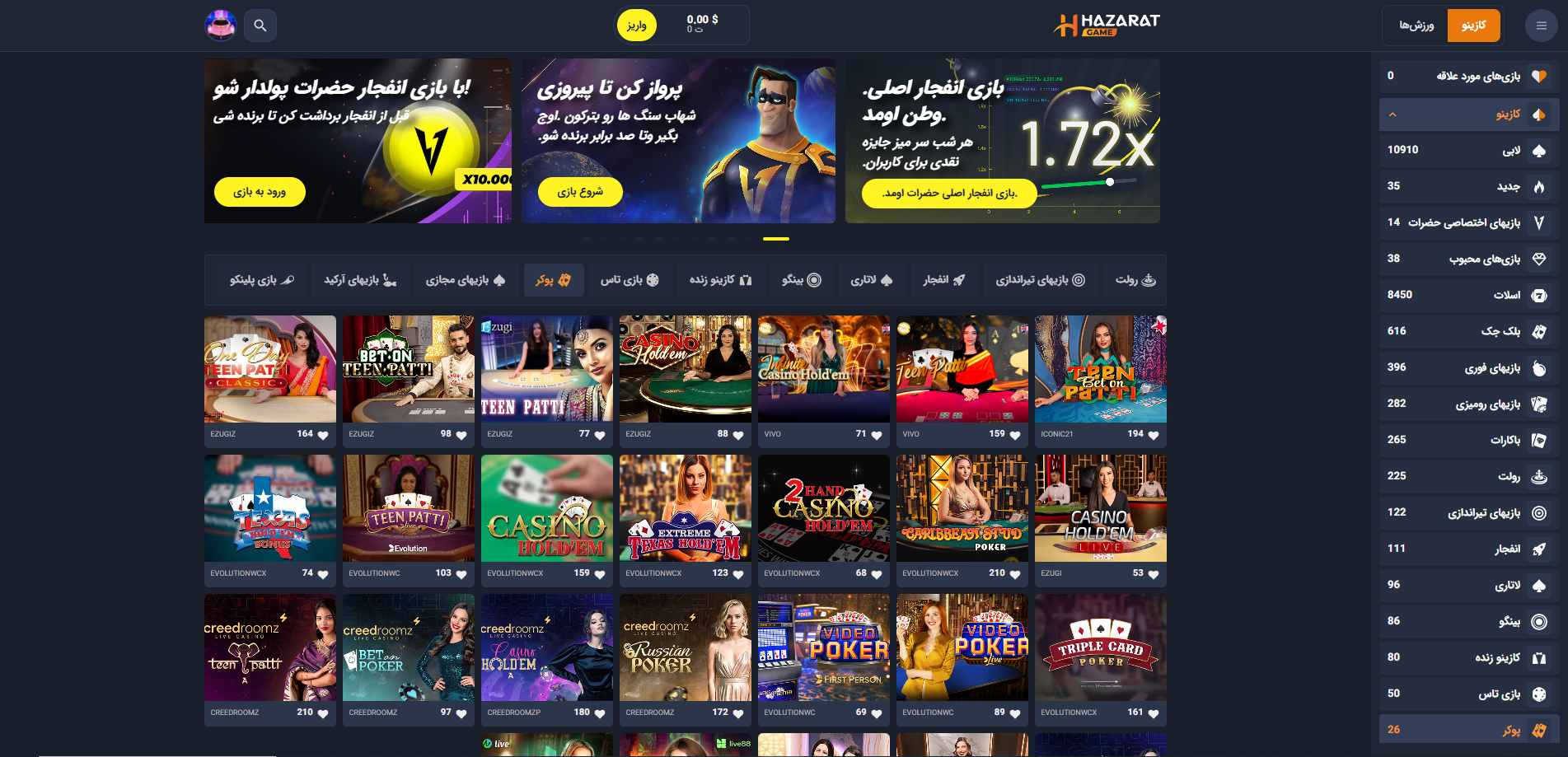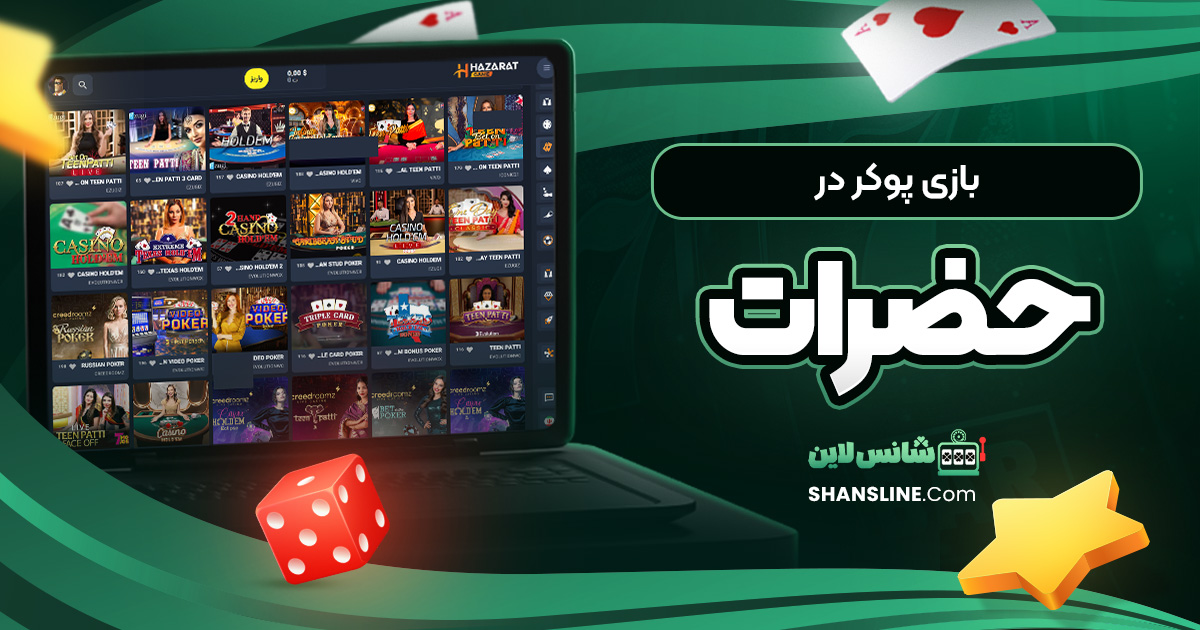 بازی پوکر یکی از اصلی ترین گزینه های کازینویی در حضرات است که طرفداران خاص خود را دارد. این بازی در نسخه های مختلف مانند تگزاس هولدم و اوماها ارائه می شود. کاربران می توانند با انتخاب میز های مختلف و متناسب با سطح تجربه خود در بازی شرکت کنند. رقابت در میز های پوکر حضرات معمولا جذاب و پر هیجان است زیرا بازیکنان با استراتژی های متفاوت وارد بازی می شوند.
