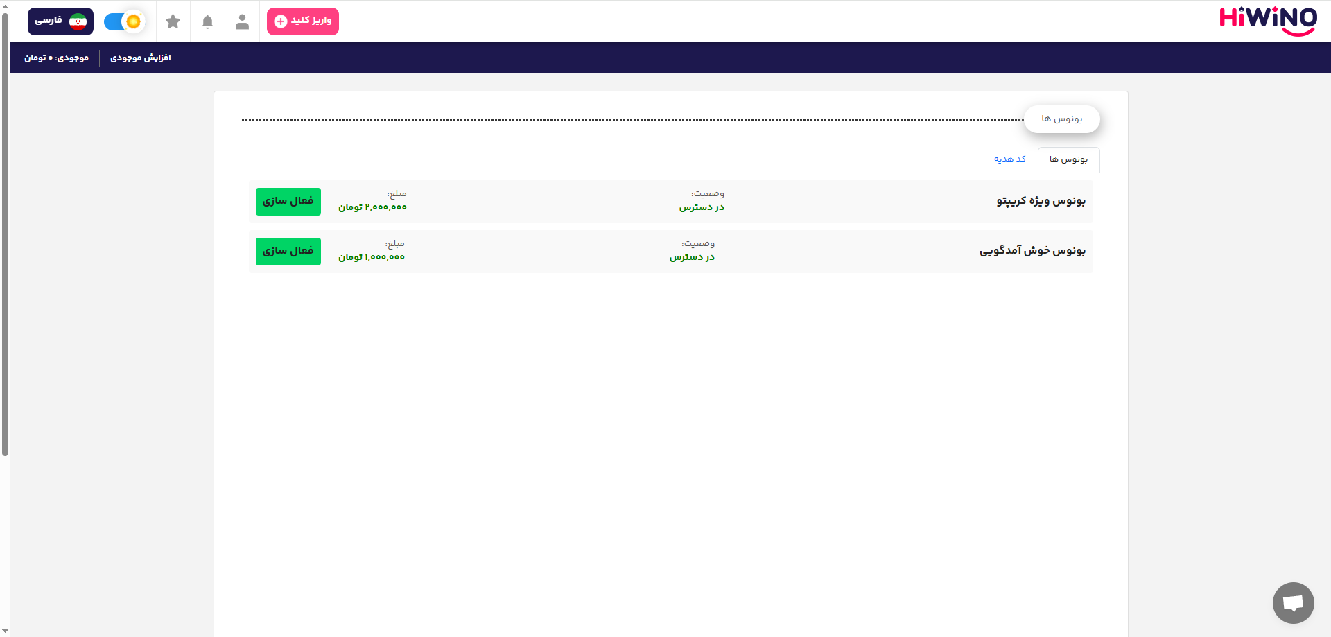 بونوس های سایت Hiwino
