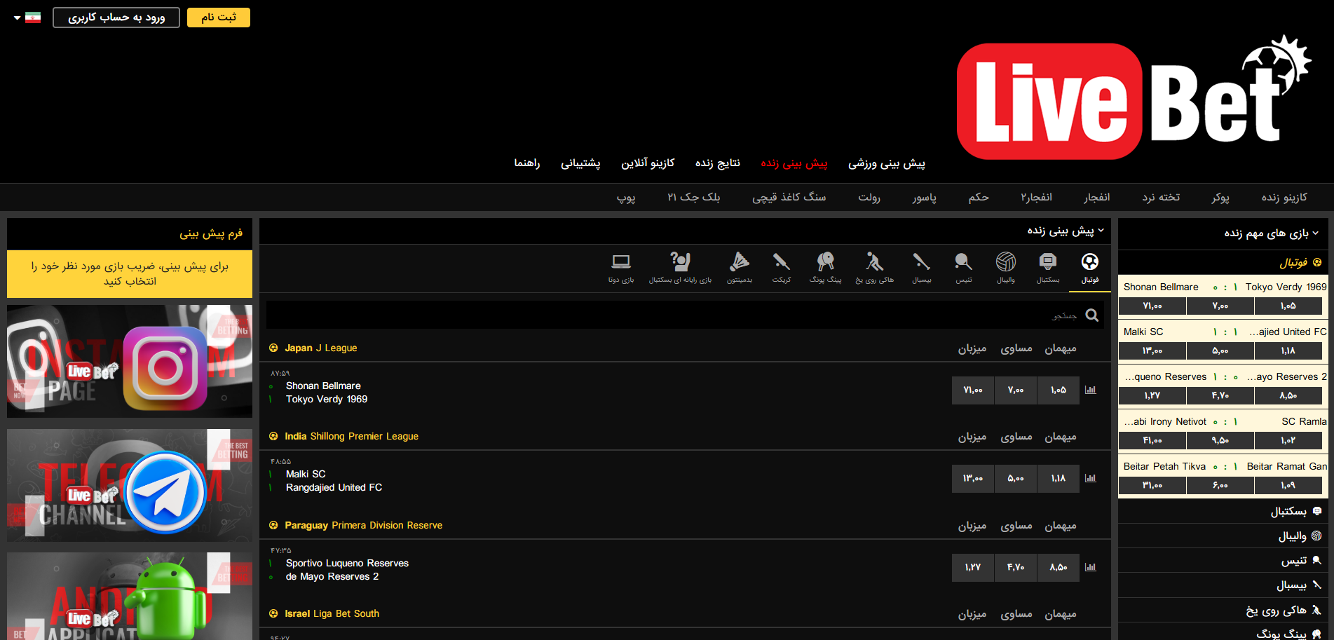 شرط بندی در Live bet شامل انتخاب بازی، تعیین مبلغ و ثبت شرط است. کاربران می توانند قبل از ثبت شرط، اطلاعات کافی درباره بازی و شانس ها کسب کنند. سایت امکاناتی برای مشاهده تاریخچه شرط ها و نتایج گذشته فراهم کرده است تا تصمیم گیری بهتر انجام شود. بعد از انتخاب گزینه مورد نظر، مبلغ شرط را وارد می کنید و شرط ثبت می شود.