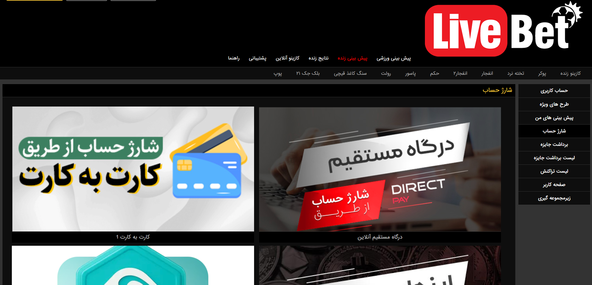 شارژ حساب برای شروع شرط بندی و بازی ضروری است و بدون آن دسترسی کامل به امکانات سایت ممکن نیست. کاربران می توانند پس از شارژ حساب، به راحتی شرط های خود را ثبت کنند و در بازی ها شرکت کنند. تجربه شارژ حساب در Live bet، ترکیبی از سرعت، امنیت و سادگی است که برای کاربران رضایت بخش خواهد بود. این مراحل به گونه ای طراحی شده که حتی کاربران تازه وارد نیز بتوانند به راحتی حساب خود را آماده استفاده کنند.