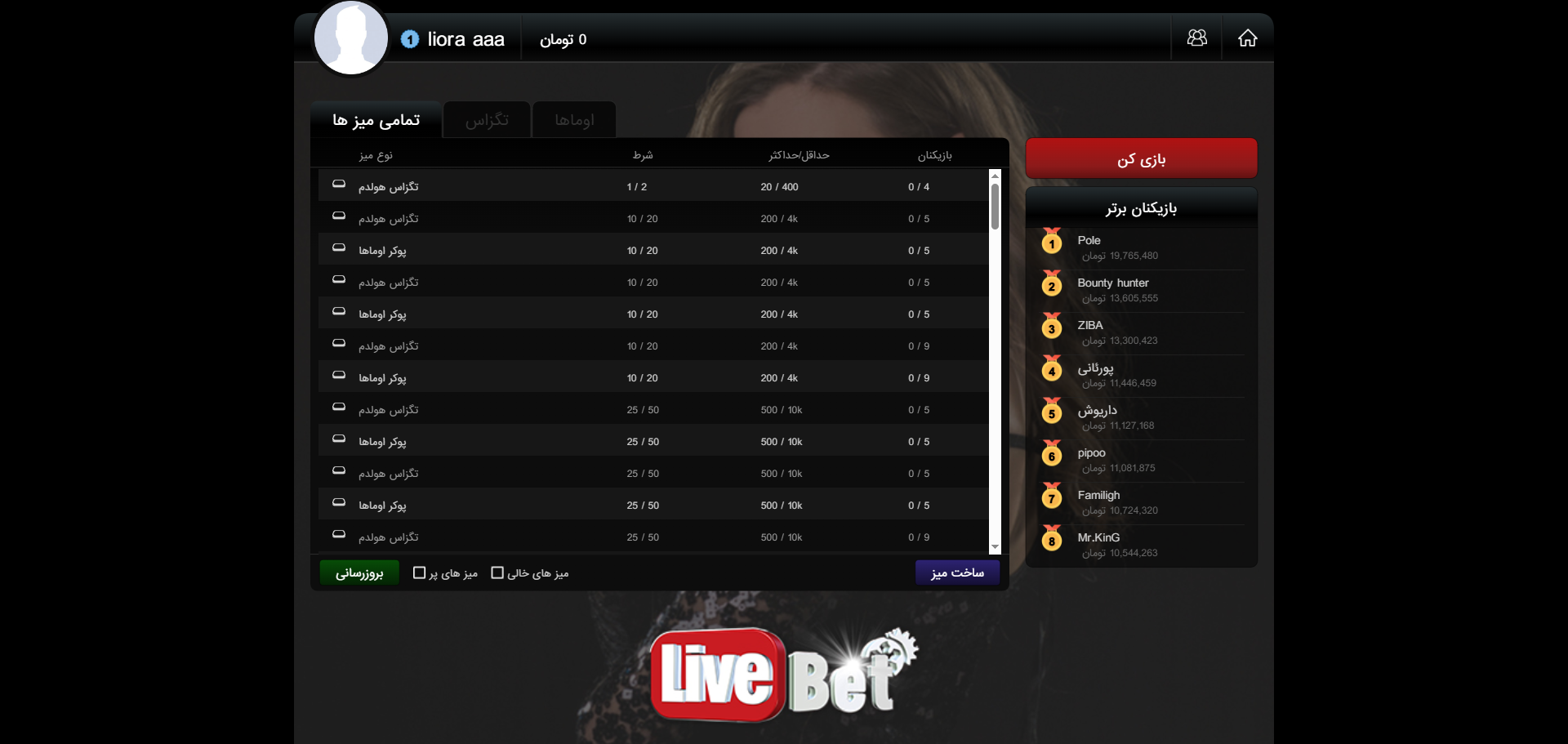بازی پوکر در Live bet شامل انواع مختلف پوکر آنلاین است. کاربران می توانند با انتخاب میز و سطح دلخواه، بازی خود را شروع کنند. قوانین بازی در سایت قابل مشاهده است و کاربران می توانند قبل از شروع بازی با آن آشنا شوند. تجربه بازی پوکر آنلاین در سایت روان است و کاربران می توانند با حوصله و استراتژی مناسب بازی کنند. امکاناتی مانند مشاهده تاریخچه دست ها، تعیین مبلغ شرط و استفاده از بونوس ها فراهم شده است.