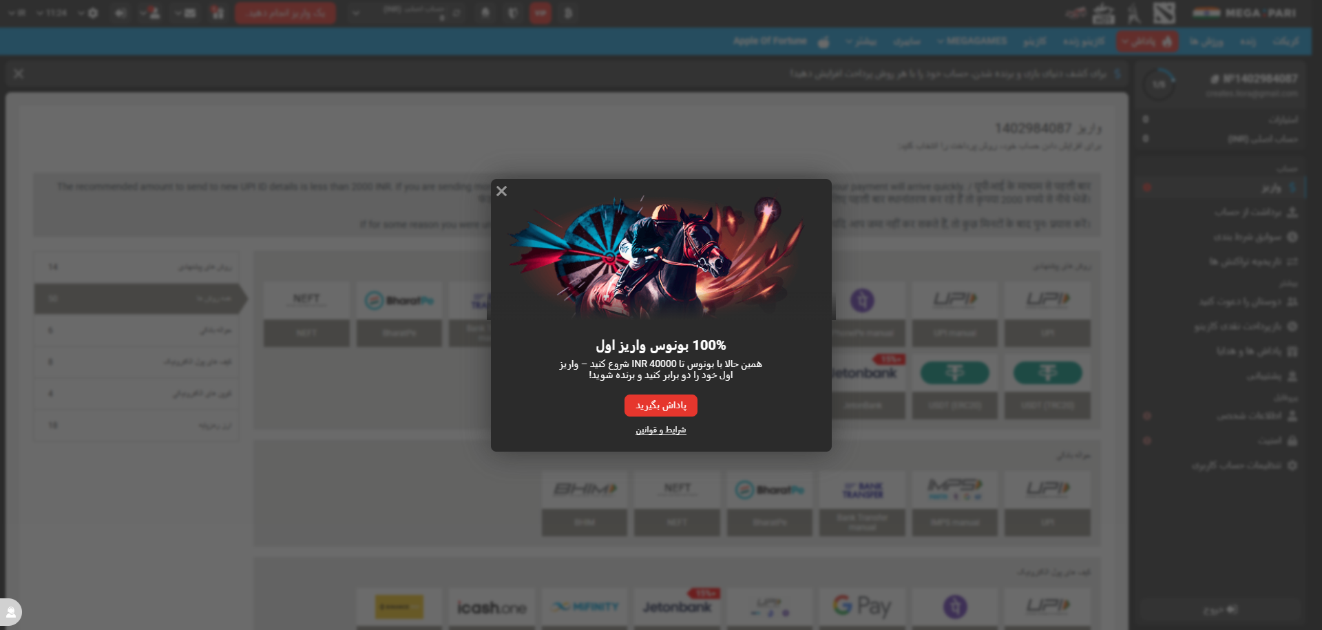 شارژ حساب: ابتدا کاربران باید حساب خود را شارژ کنند تا سرمایه لازم برای شرط بندی در دسترس باشد.