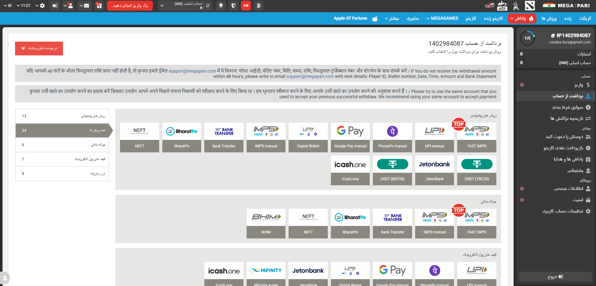 ووچر پرفکت مانی: این روش از طریق کد ووچر انجام می شود و به کاربران امکان نقد شدن فوری موجودی را می دهد. کاربران MegaPari می توانند به سرعت کد خود را دریافت کرده و آن را نقد کنند.