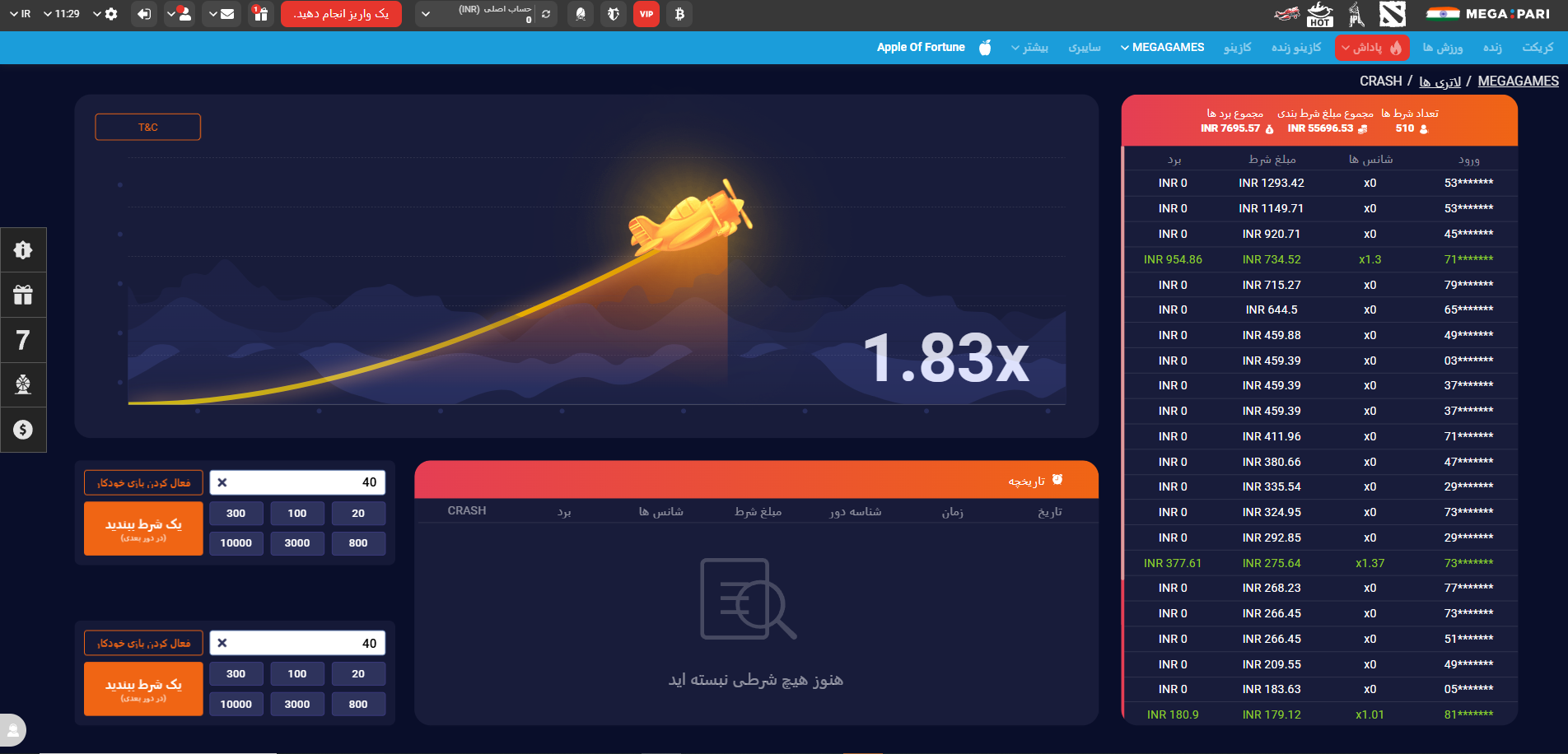 برداشت شرط: کاربران قبل از توقف ناگهانی نمودار باید شرط خود را برداشت کنند تا سود کسب شود.
