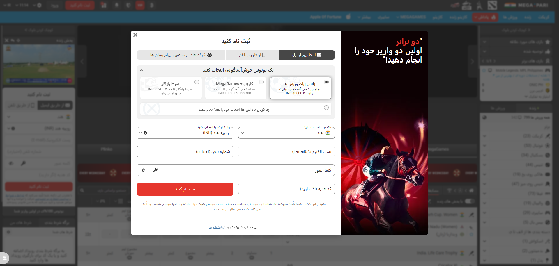 ابتدا مرورگر خود را باز کرده و آدرس رسمی سایت مگاپاری را وارد کنید. پس از بارگذاری صفحه اصلی، روی گزینه “ثبت نام” در بالای صفحه کلیک کنید.