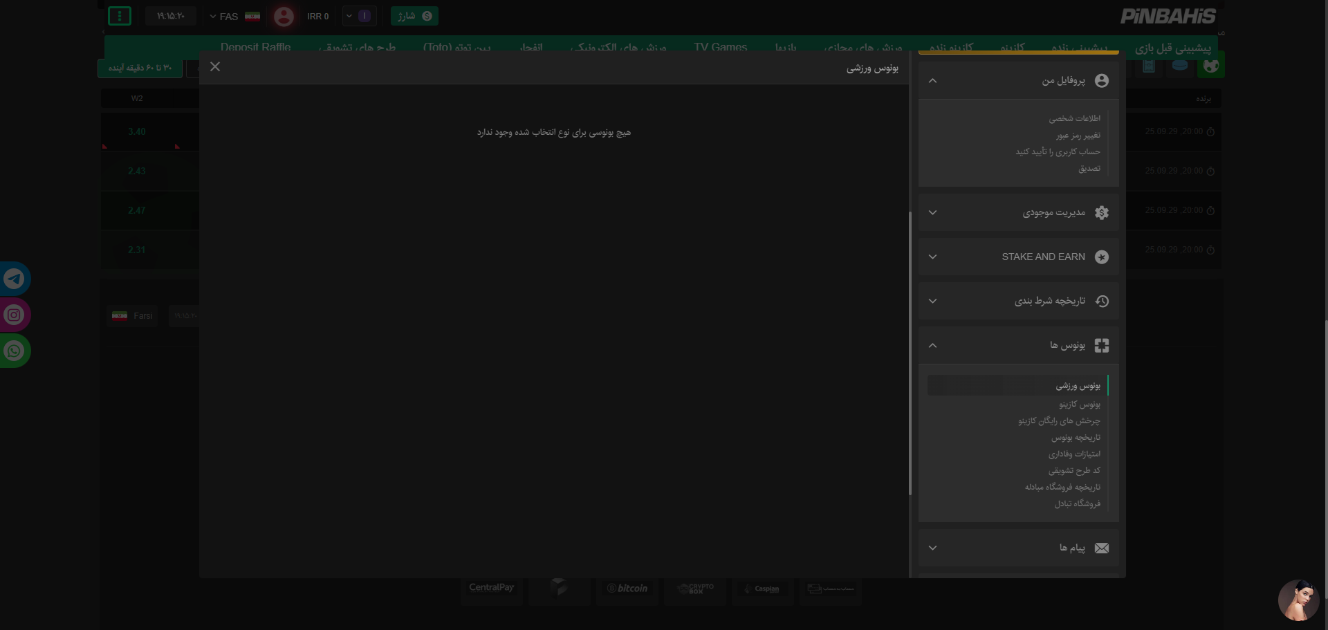 این آفر ویژه کاربرانی است که تاکنون هیچ برداشتی از سایت پین باهیس نداشتهاند. پس از انجام واریز، تنها در صورتی میتوانید از فری بت ۱۰۰٪ استفاده کنید که در بخش ورزشی شرطبندی کرده و کل موجودی خود را باخته باشید. این فری بت تا سقف ۵ میلیون ریال و در بازه ۲۴ ساعته قابل دریافت است و تا زمانی که هیچ برداشتی انجام ندادهاید، میتوانید هر روز از آن بهرهمند شوید.