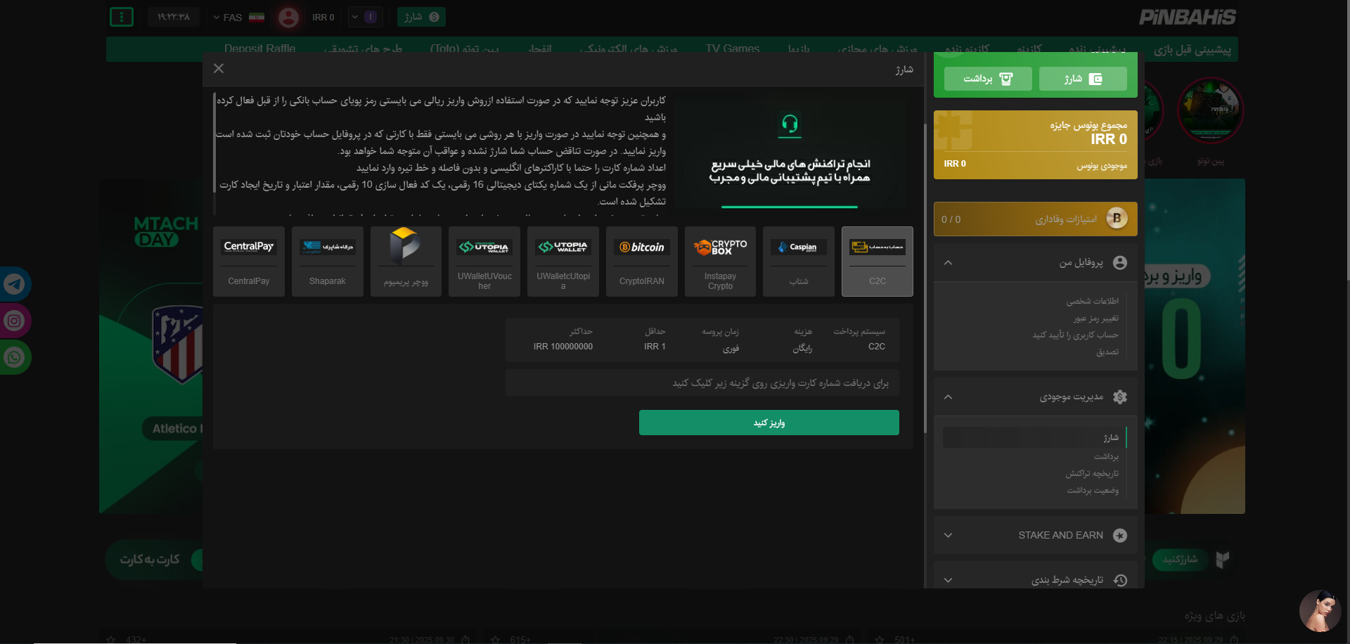 روش کارت به کارت در PinBahis یک روش امن و سریع برای برداشت وجه است که به کاربران امکان میدهد مبلغ مورد نظر را به حساب بانکی خود منتقل کرده و بدون مشکل از سودهای کسبشده بهرهمند شوند.