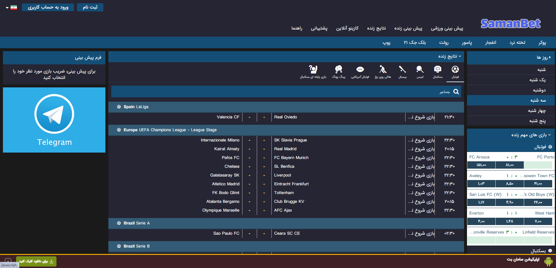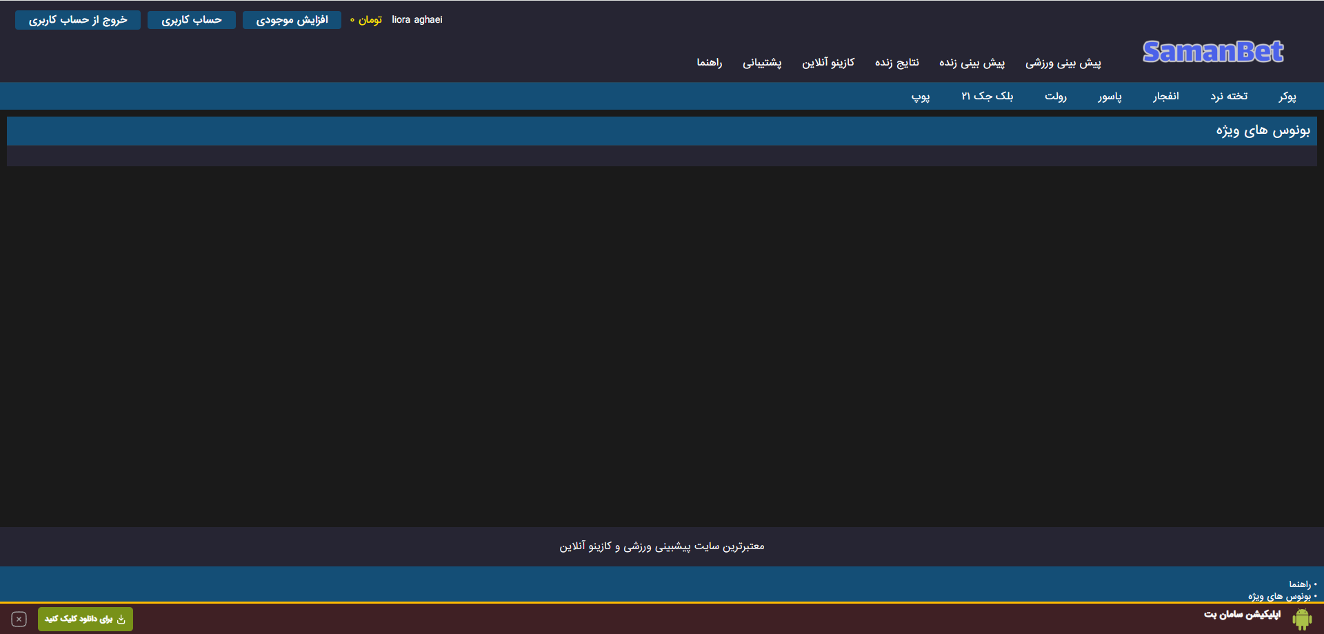 سامان بت با ارائه خدمات متنوع در زمینه پیش بینی ورزشی، بازی های کازینو آنلاین و کازینو زنده، محیطی امن و هیجان انگیز برای کاربران فراهم کرده است. این سایت با ضرایب بالا، اپلیکیشن اختصاصی اندروید، پشتیبانی ۲۴ ساعته و روش های متنوع واریز و برداشت، تجربه ای حرفه ای برای شرط بندی ارائه می دهد.