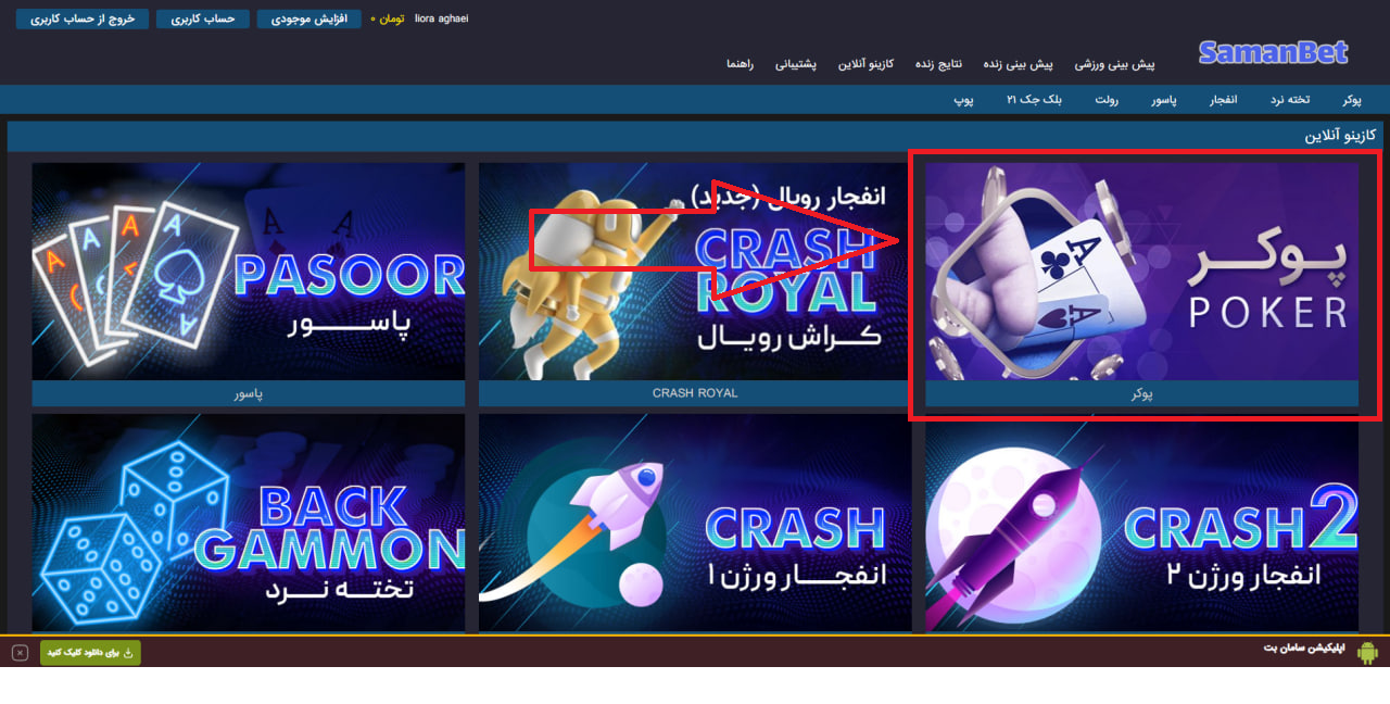 وارد بخش کازینو شوید و از بین بازی هایی مثل انفجار، رولت، پوکر یا بلک جک یکی را انتخاب کنید.