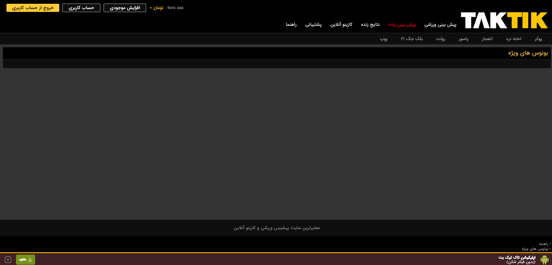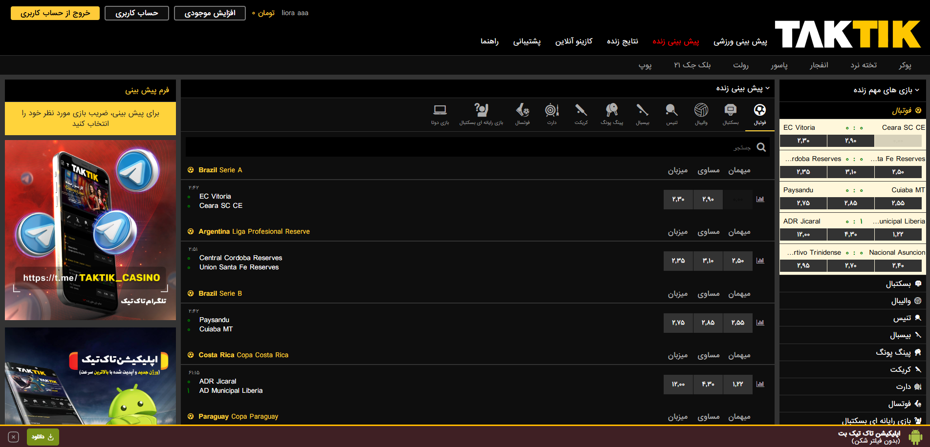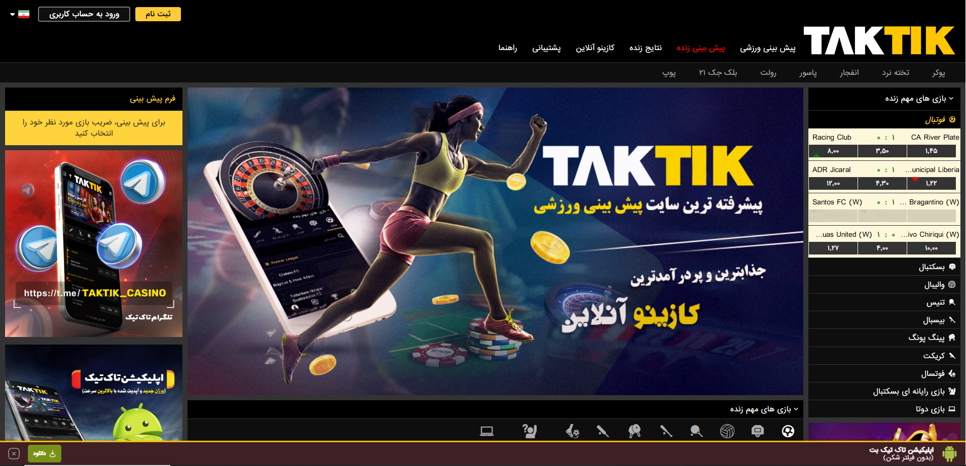 سایت تاک تیک یکی از معتبرترین سایت های شرط بندی ایرانی و پیش بینی زنده می باشد. تاک تیک فعالیت خود را از ابتدای سال 1398 آغاز کرده و در مدت کوتاهی توانسته با ارائه امکانات متنوع در بخش های مختلف از جمله کازینو آنلاین و پیش بینی فوتبال توجه کاربران زیادی را به خود جلب کند. سایت شرط بندی تاک تیک نیز از اسکریپ های مونتیگو بهره می برد که کیفیت و امنیت بالایی را برای کاربران فراهم می کند.