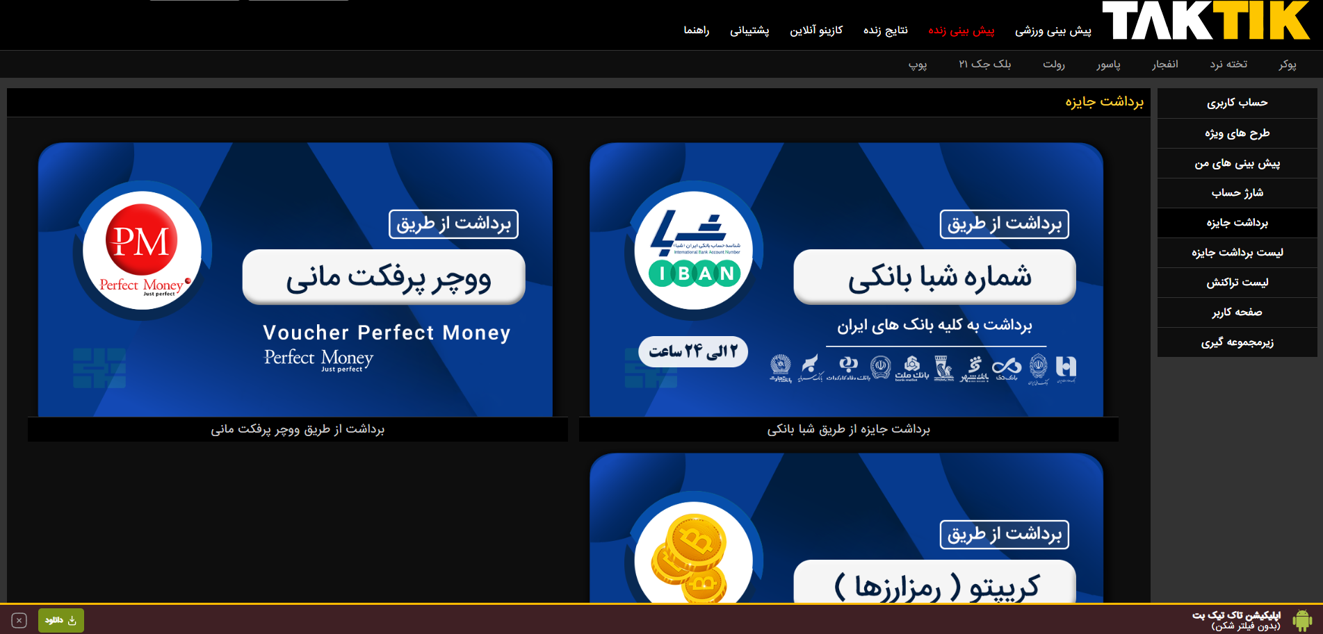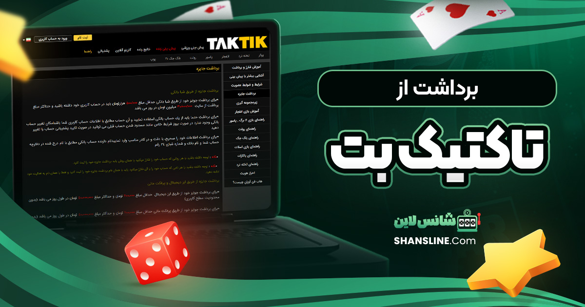 برداشت از حساب در Taktik Bet به سادگی انجام می شود. کاربران می توانند از طریق روش های معرفی شده در سایت درخواست برداشت بدهند و مبلغ مورد نظر به حساب آن ها منتقل شود. فرآیند برداشت معمولاً سریع انجام می شود و بسته به روش انتخابی، زمان پردازش متفاوت است.