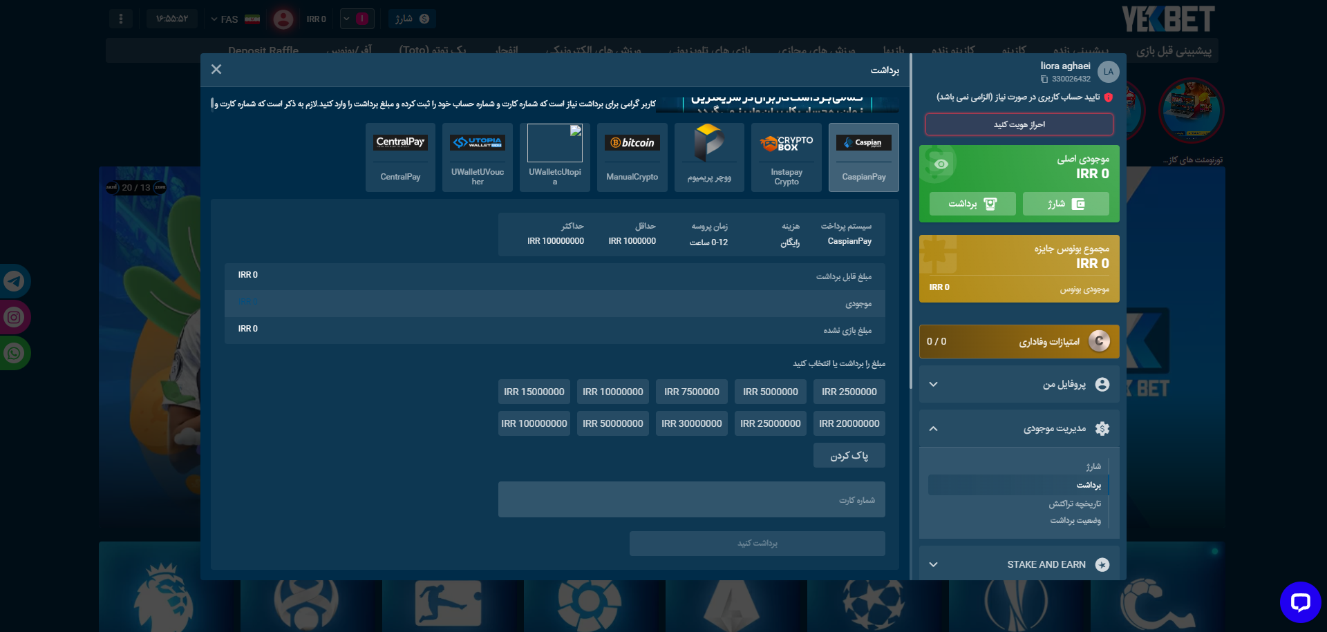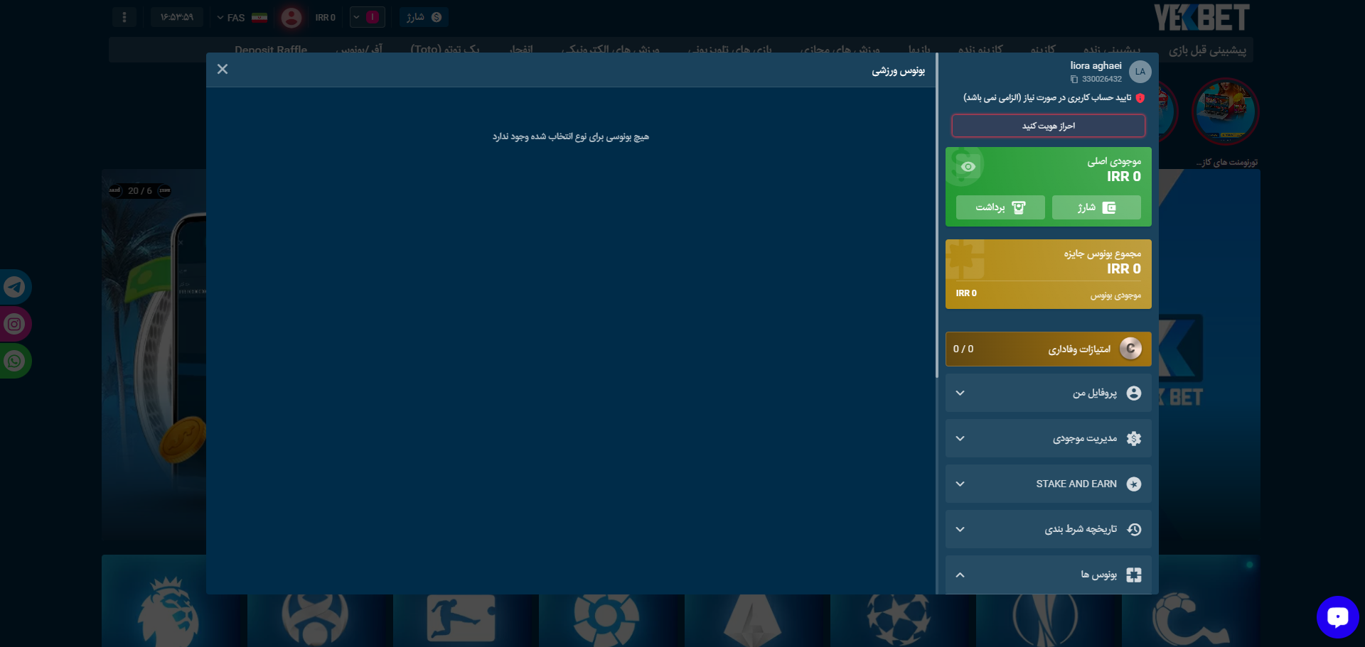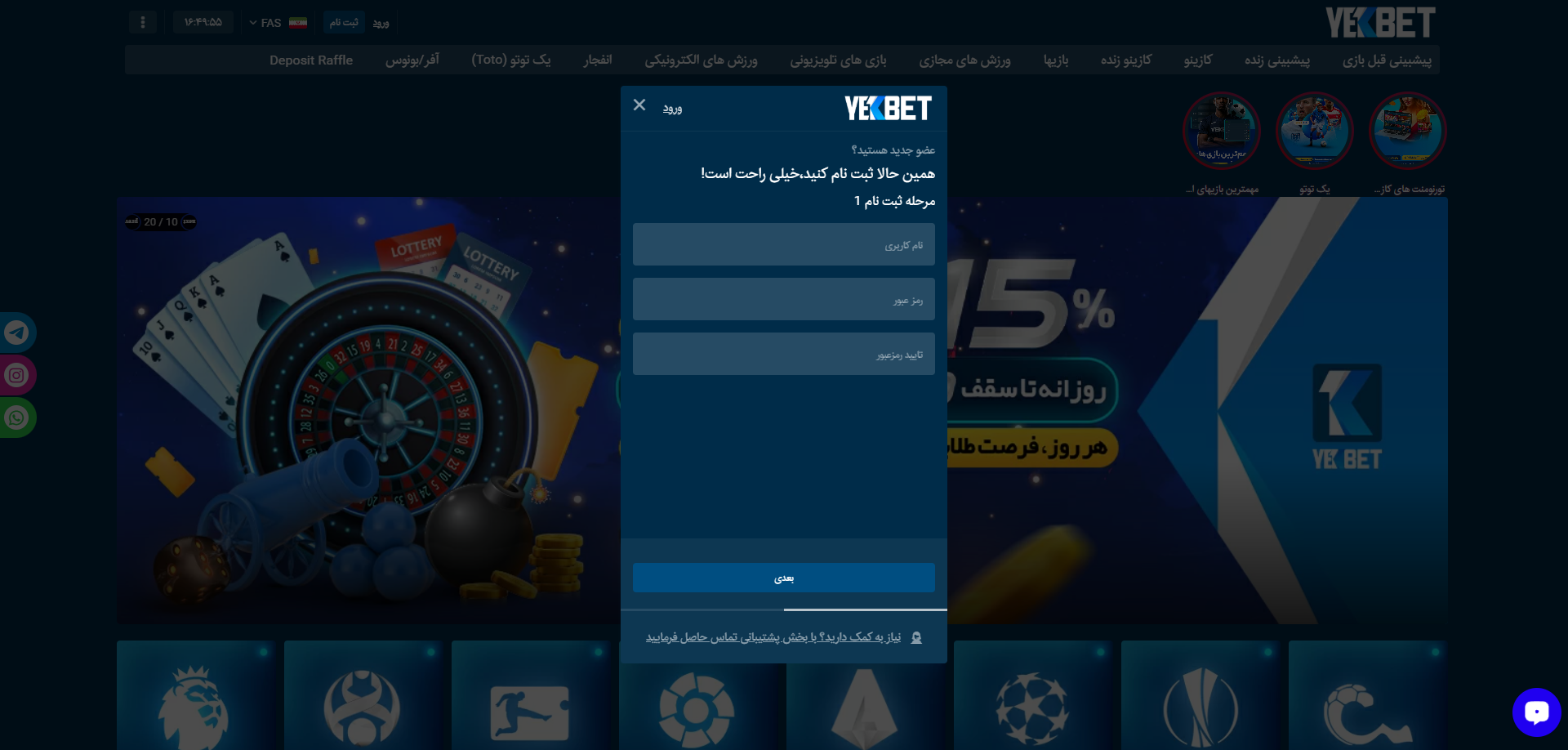 وارد سایت YekBet شوید و با نام کاربری و رمز عبور به حساب خود وارد شوید. اگر هنوز ثبت نام نکرده اید، ابتدا در 1Bet ثبت نام کرده و حساب خود را شارژ نمایید.